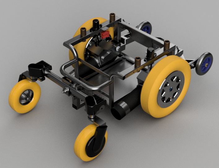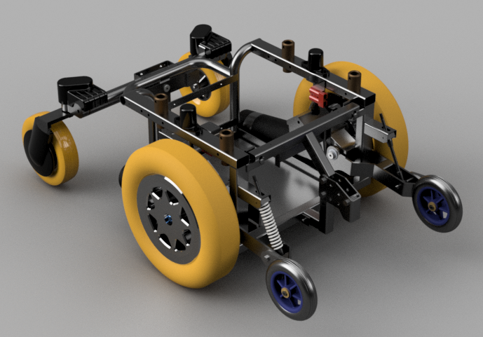 The main frame is completely modeled, to a precision necessary for just about any mechanical parts we'll need to make. We got a couple of 80 Amp-Hour AGM batteries which do a good job of almost completely filling the battery area. That's a nice 50% increase in lifespan over the 55 Amp-Hour dead bricks that came with the chair.